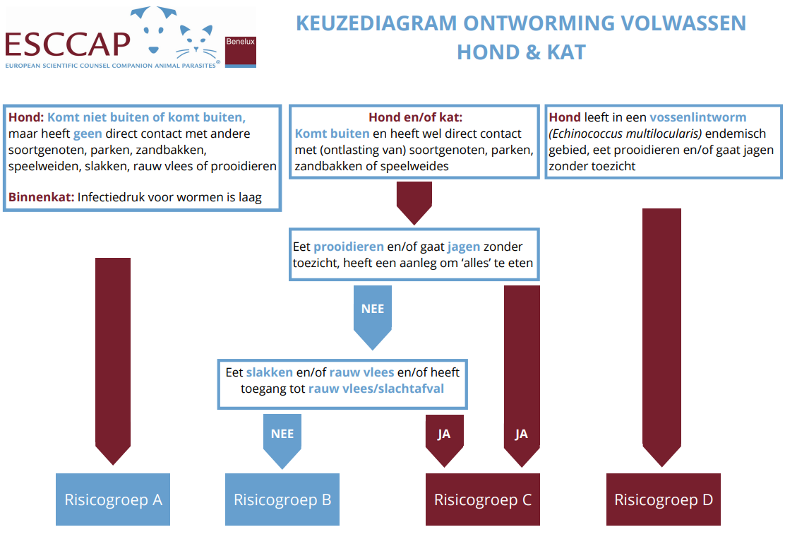 Met behulp van onderstaand keuzediagram kun je snel bepalen in welke groep jouw hond of kat valt. Bij elke groep hoort een specifiek ontwormingsadvies.