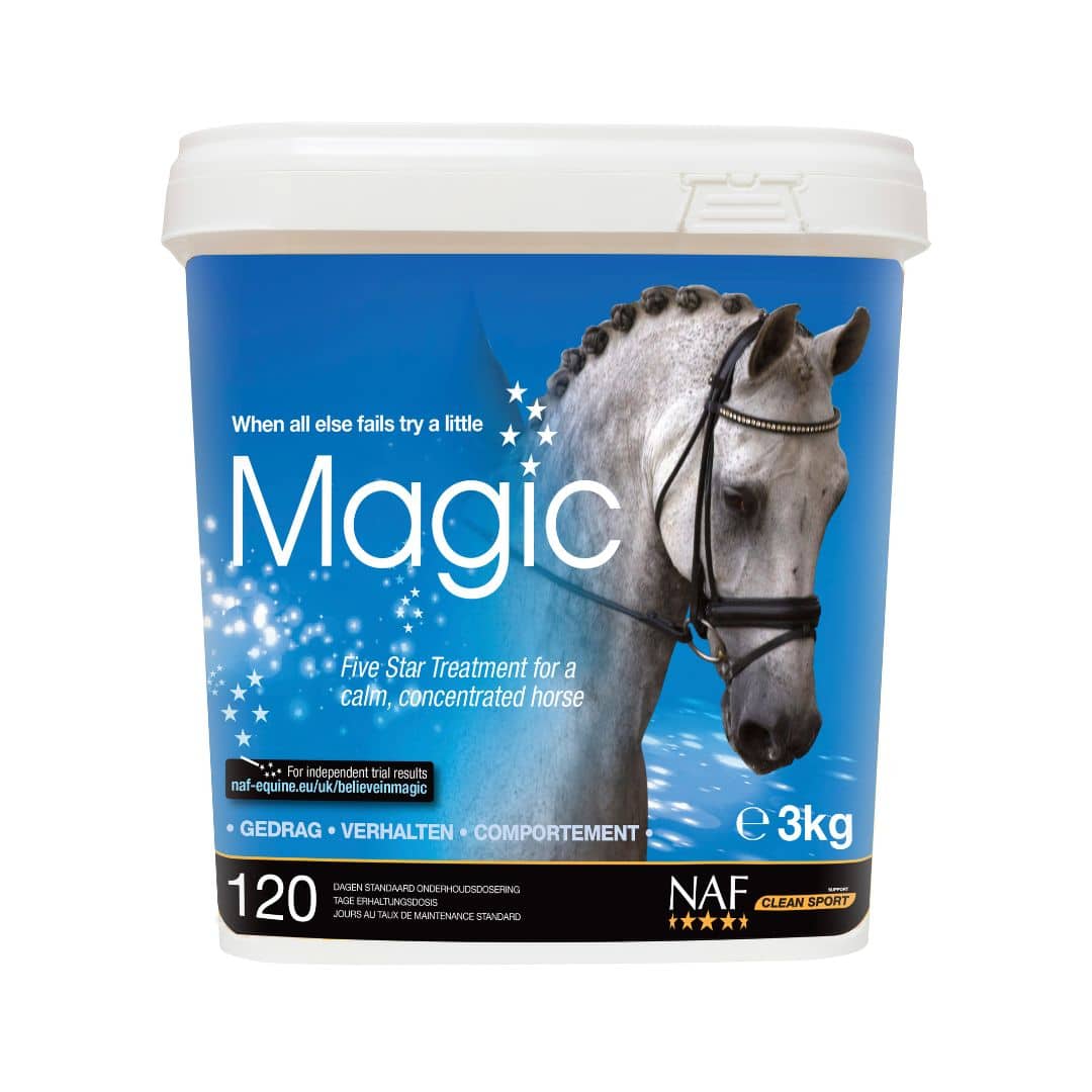NAF Magic is gebaseerd op magnesium. Magnesium is essentieel voor het welbevinden van een paard, het zorgt onder meer voor het omgaan met spanning. Magnesium beïnvloedt ook de spierspanning. Een paard met een tekort aan magnesium kan er wat ‘strak’ uitzien in zijn manier van gaan, misschien wat prikkelbaar zijn, of een gebrek aan zelfvertrouwen tonen. Een laag magnesium gehalte bij een paard kan veroorzaakt worden door de eigen stofwisseling, door een tekort aan weidegang, of door veel reizen en wedstrijden. NAF Five Star Magic bestaat natuurlijk uit veel meer dan magnesium. Het bevat ook een unieke combinatie van kruiden die traditioneel dienen om vertrouwen en concentratie te ondersteunen. Dit kruidenmengsel gecombineerd met magnesium heeft als effect dat het de rust, ontspanning en focus ondersteunt. En daarmee de trainbaarheid.